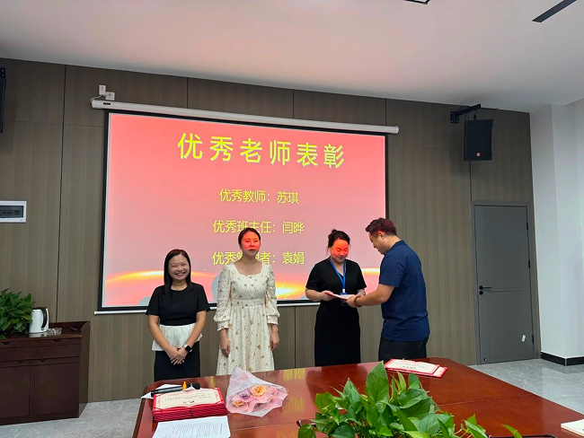 经过严格评选与综合审定,苏琪老师荣获“优秀教师”称号,闫晔老师被评为“优秀班主任”,而袁娟老师则摘得了“优秀管理者”的桂冠。这三位老师用自己的实际行动诠释了教育的真谛,成为了全体教师学习的榜样。在热烈的掌声中,袁校亲自为获奖老师颁奖,对他们的辛勤付出和卓越贡献表示了高度认可和衷心感谢。