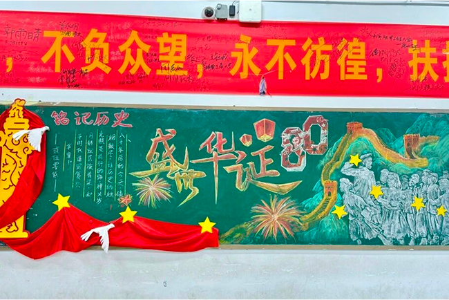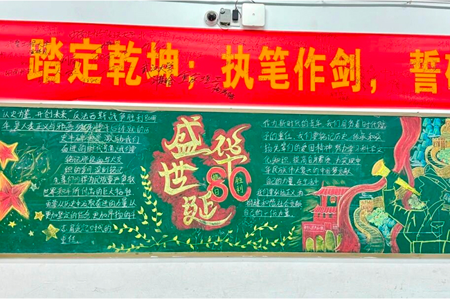 为响应《岳阳市中小学校“铭记抗战历史 传承红色基因 争做时代新人”主题宣传教育活动》,湘江商贸科技职业学校以“铭记抗战历史 传承红色基因 争做时代新人”为主题,举办了黑板报评比活动。经过激烈角逐,2502班、2404班、2501班分别斩获一、二、三等奖。此次活动不仅展现了学生们的艺术才华,更深化了对抗战历史的理解与红色精神的传承。