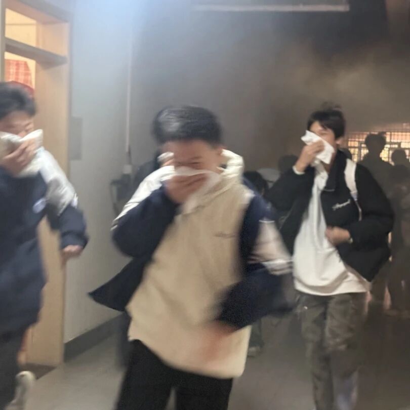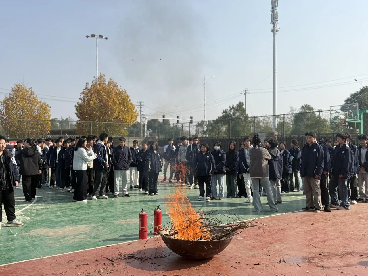 "叮——"随着警报声响起,消防疏散演练正式拉开帷幕。全校师生按照预定路线,弯腰低姿、捂住口鼻,快速有序撤离至安全区域。消防员现场点评演练过程,并指导师生开展火盆灭火实操训练。