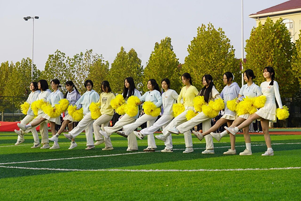 2503班无人机专业师生首次将科技元素融入体育盛会,无人机腾空而起,在蓝天白云间展现国旗立体画卷。这场科技与青春的碰撞,瞬间点燃全场热情。啦啦操社团带来的《push push》表演更以整齐划一的动作、充满爆发力的舞姿,将青春活力演绎得淋漓尽致。02【文化传承,方阵炫技】